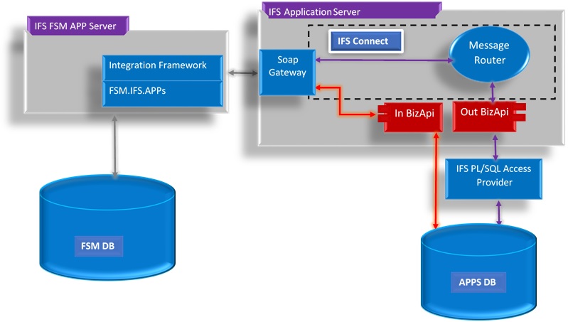 Ein Diagramm der Integrationsarchitektur wird unten angezeigt. Das Integrationsframework, bei dem es sich um ein Servermodul handelt, das eingehende und ausgehende Integrationen zwischen FSM und anderen Systemen generisch unterstützt, ist im IFS FSM APP-Server enthalten. Es verwendet Import-/Export-Zuordnungen, die in den Metadaten der FSM-Datenbank definiert sind, um XML-Nachrichten und API-Aufrufe flexibel zwischen IFS Cloud und FSM abzubilden, die leicht an die Kundenbedürfnisse angepasst werden können und über Metadatenänderungen im FSM-Client erweiterbar sind. Der standardmäßige IFS PL\SQL Access Provider wird für die Kommunikation mit IFS Cloud verwendet.
