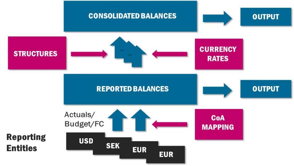 reporting and adjustments, as well as defining one or more consolidation structures. How this is done is described in