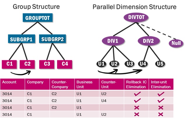 - Support for segment reporting, i.e. elimination based on an alternative dimension structure.