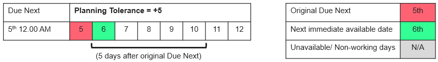 さらに、プログラム スケジュールの発生 (次回期限) が、選択したカレンダー オプションによって決定された利用不可日/非作業日に設定されている場合は、計画許容値 (日数) は、プログラム スケジュール明細の元の次回期限を、サービス発生を計画できる即時利用可能日/作業日にシフトするために使用できます。計画許容値には +/- を使用できます。正の計画許容値は、元の次回期限からの将来計画を示し、負の計画許容値は、元の次回期限からの逆計画を示します。